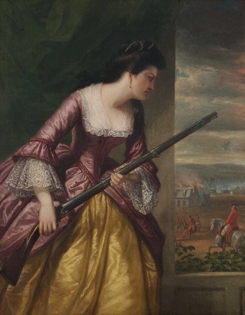 The figure on Revolutionary Mothers's cover is Abigail Hinman, who (so goes the legend) grabbed a musket to take aim at friend-turned-national-traitor Benedict Arnold as he and his forces invaded her home in 1781 (“Arnold’s Raid on New London [Connecticut]"). This particular stylization of events seems doubtful, but the overall circumstances were not.