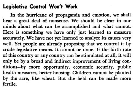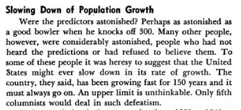 Finally, Chase was not sounding an emergency klaxon: “What is the [population curve] going to do to us here in America?…Fortunately, it moves slowly and nothing need happen very suddenly. If, however, we pretend it is not there and one day wake up, some unpleasant things might happen very dramatically…If we face the situation with our eyes open, we can probably handle it.”