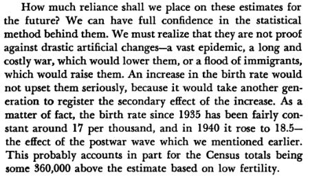 Well, we know that pretty much right after all of this the U.S. entered the baby boom. Chase, standing in 1941, had been fully confident in future population projections showing slowing growth and eventual decline. He had the advanced statistics of the day on his side, and his underlying assumptions seemed reasonable enough. And yet he, and many others, got their predictions exactly backwards.