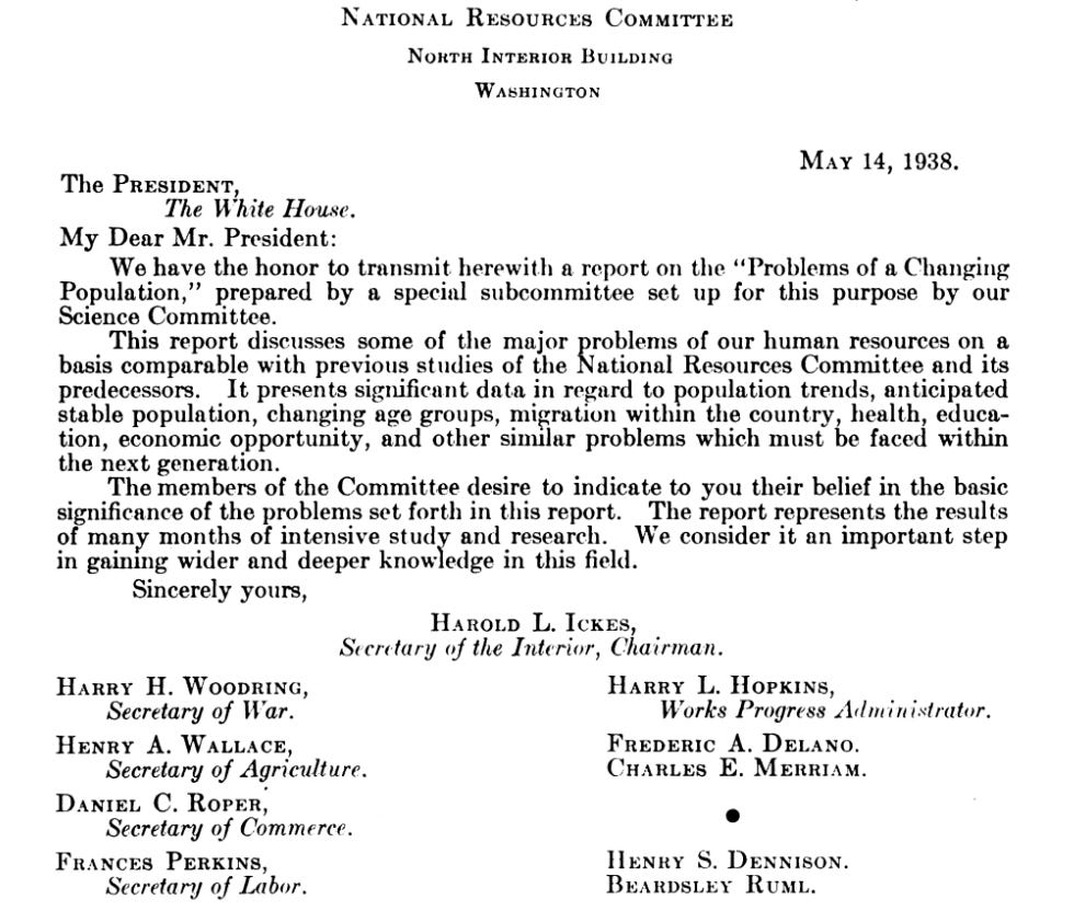 “The Problems of a Changing Population: Report of the Committee On Population Problems to the National Resources Committee” United States National Resources Committee. Science Committee (May, 1939).