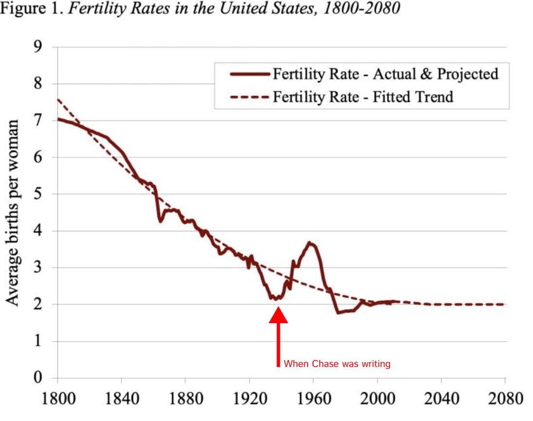 Chase was writing at the contemporary low point of fertility in the United States. Below I’ve reproduced a graph that Derek used in his post, with a red arrow to emphasize what the world around Chase must have looked like.