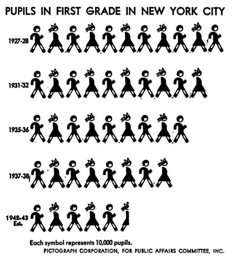 OK! Let’s take a look at what a famous contemporary writer1, Stuart Chase, said at the time. In the February 1939 edition of The Atlantic, Chase opens his piece “Population Goes Down” with a dramatic picture: