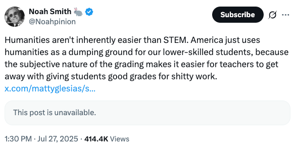“The humanities should be harder: Low standards have devalued non-STEM study,” , Matt Yglesias (August 7, 2025).